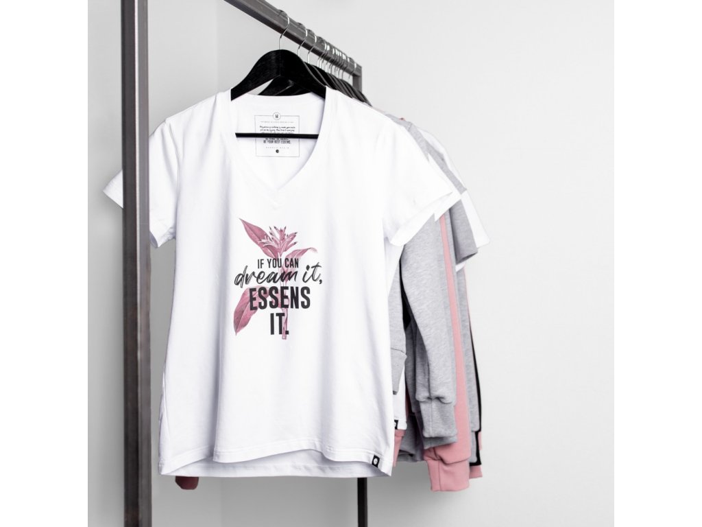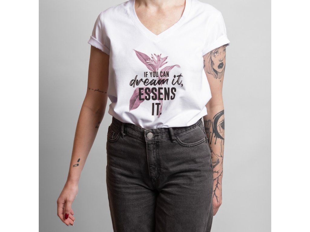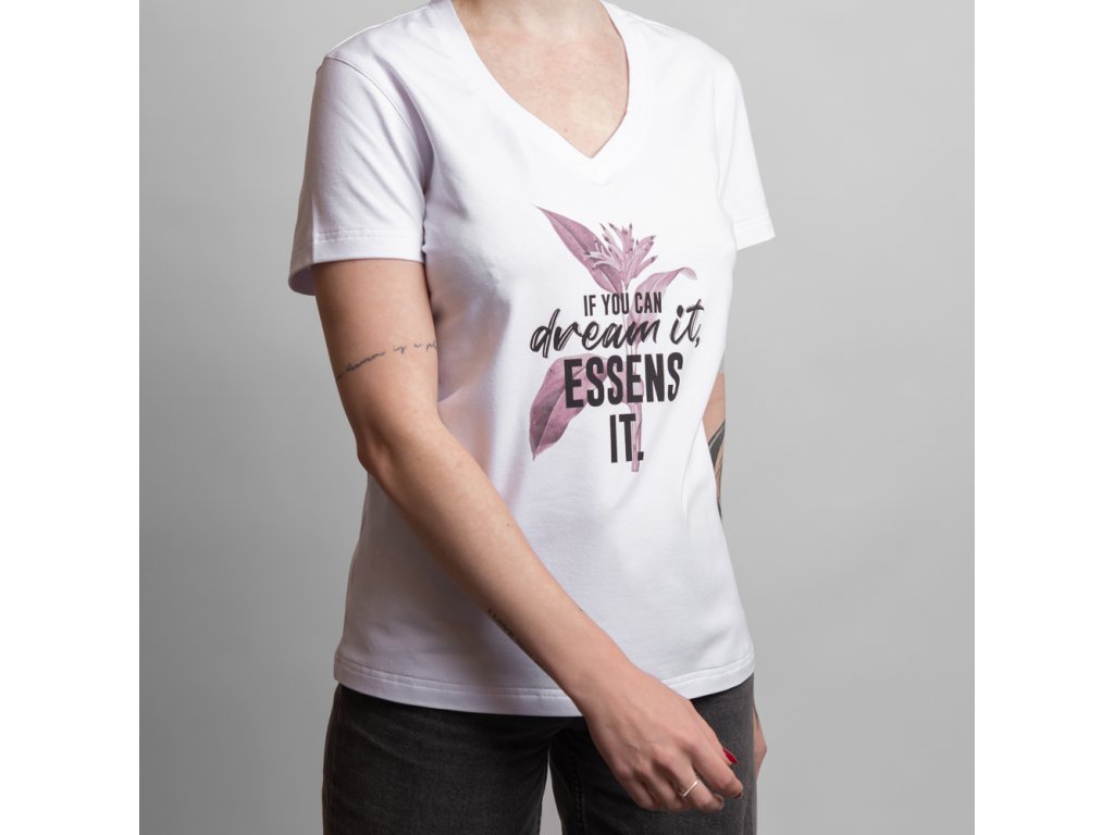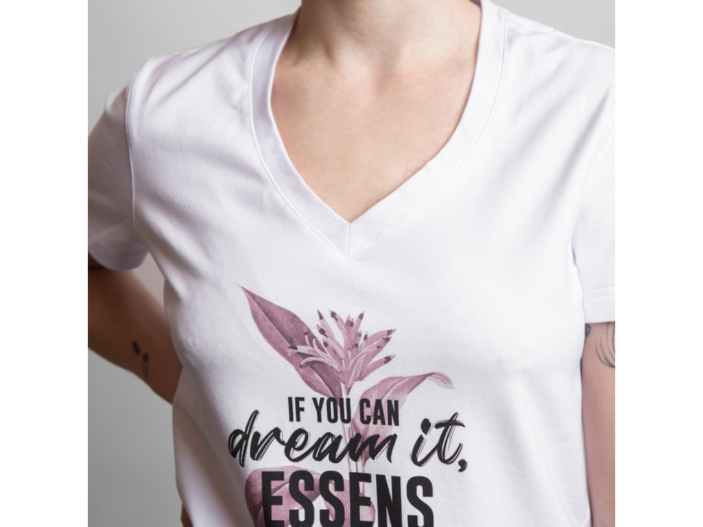 Biele dámske tričko s originálnou dizajnovou potlačou IF YOU CAN DREAM IT ESSENS IT. so strihom zvýrazňujúcim dámsku siluetu a s výstrihom do “V”. S elegantným nápisom ESSENS STYLE na chrbte v hornej časti.
